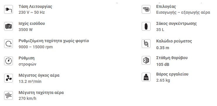 Πανίσχυρος κινητήρας 3500W, ιδανικό εργαλείο για εργασίες στον κήπο και τη βεράντα, όπως συγκέντρωση φύλλων καθώς διαθέτει και τεμαχιστή φύλλων, κατάλληλο για γρήγορο και φιλικό προς τον χρήστη καθαρισμό ανοιχτών χώρων.