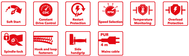 • Ηλεκτρονικός έλεγχος με μικροεπεξεργαστή: αδιαβάθμητη προεπιλογή στροφών, σταθεροποίηση στροφών μέσω ταχογεννήτριας, προστασία υπερφόρτωσης, προστασία επανεκκίνησης και παρακολούθηση θερμοκρασίας